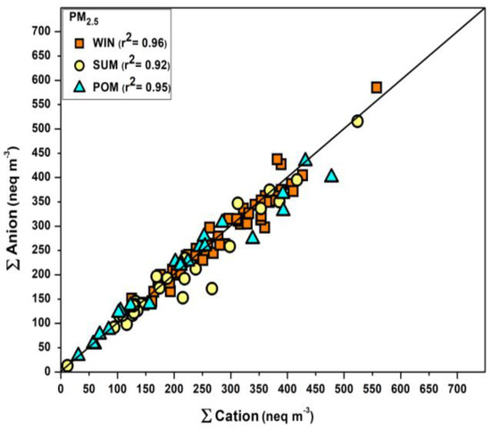 Correlation plot between total anion and total cation in equivalence units for aerosols collected in different seasons. (WIN = Winter, SUM = Summer, POM = Post-monsoon).
