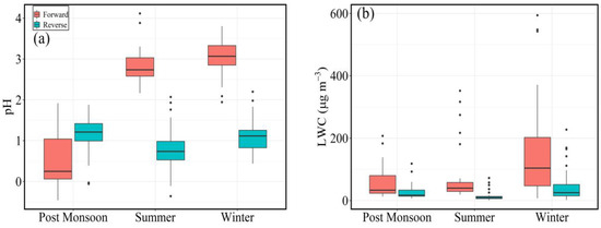 The seasonal variability in estimated aerosol pH using ISORROPIA-II (forward and reverse mode) is shown as a box plot in Figure 2a,b. The estimated pH in the forward and reverse modes ranged from −0.36 to 4.11 (mean = 2.49 ± 1.11) and −0.36 to 2.2 (mean = 1.02 ± 0.46), respectively. Relatively large seasonal variability was observed in pH estimated from the forward mode in contrast to the reverse mode, with higher values during summer and winter months. However, a relatively more acidic value was estimated during the post-monsoon months. Interestingly, the estimated pH in reverse mode for all months is comparable with those estimated for the post-monsoon month (forward mode). A large overestimation was observed for the estimated pH in the forward mode for the winter and summer months. This may be attributed to the uncertainty associated with the availability of gas-phase data. Due to the availability of simultaneous aerosol and gas-phase data, the forward-mode estimates were higher than the reverse-mode estimates. While analyzing the seasonal variations in the pH values of FPM, the role of air mass derived from different sources (anthropogenic versus natural dust/sea salt) is very important and its impact can be inferred from the AMBT analyses (discussed in a later section). Most of the FPM pH values were around 2–4, with only a small fraction, particularly during the post-monsoon season, having a pH of 2 or below based on bulk composition. The results from all three seasons indicated that aerosol pH changed considerably for a given group of meteorological conditions (temperature and RH). In addition to FPM pH, ISORROPIA-II was used to estimate the liquid water content (LWC) in PM2.5 samples through forward and reverse mode, and their seasonal variation is displayed as box plots in Figure 2b. The LWC associated with the WSIC has varied from 7.1–593.9 (111.7 ± 121.2) µg m−3 and 0.66–227.5 (32.7 ± 38.3) µg m−3 in forward and reverse mode, respectively. The observed seasonal variability of LWC in reverse mode was found highest in winter with an average value of 42.4 ± 46.1 µg m−3, followed by post-monsoon and summer with average values of 29.8 ± 28.7 µg m−3 and 15.6 ± 17.5 µg m−3, respectively. However, in the forward mode, the concentration of LWC showed a higher degree of variation having average values of 155.8 ± 148.4 µg m−3, 108.3 ± 135.1 µg m−3, 59.5 ± 102.3 µg m−3 during winter, summer and post-monsoon, respectively. Both reverse and forward approaches forecast different FPM pH and LWC values. Despite significant quantities of gas-phase ammonia and high RH, the models in reverse mode predict very acidic conditions over extended periods. Furthermore, the models in reverse mode are extremely sensitive to measurement uncertainty [55]. This statement is consistent with earlier reports that demonstrate that the use of FPM-gas inputs improves model performance significantly [33,45,56].