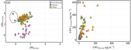 Correlation plots between estimated (a) aerosol pH and (b) liquid water content in forward and reverse mode of PM2.5 during the study period at Goa. (outliers are in a circle and they are not used for correlation calculation).