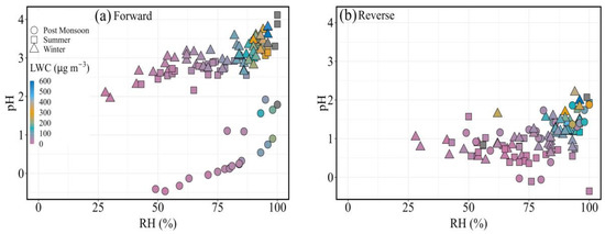 We further assessed the relationship between the estimated pH and the RH associated with the samples, and the scatter plot between them is shown in Figure 4a,b. A very general increasing trend was observed between aerosol pH and relative humidity, which is more prominent in the forward mode in contrast to the reverse mode. This increase is shown in the summer and winter as well as the post-monsoon samples, although they have different slopes (Figure 4a). However, up to 80% RH, there is no substantial increase in pH in the reverse mode (Figure 4b); but, a rapid increase is displayed post 80% RH. This increasing trend is also nicely correlated with an increase in liquid water content (Figure 4b). In this study, a 24 h average of RH has been considered to get a single data point and compared with the pH of FPM. There is significant diurnal variability expected for RH, so we attempted sensitivity analyses to assess the impact of varying RH on the pH of FPM. The variation in pH for FPM for all samples at different RH values is shown in Supplementary Material 1 (Figure S1). A high RH condition, which is a typical characteristic of a coastal site, enables aqueous-phase pathways for SO2 oxidation to take place as the particulate matter takes up more water from the atmosphere. The atmospheric liquid water content increases by orders of magnitude when the atmosphere warms up during the day, followed by sea breezes; hence, the SO2 aqueous-phase oxidation pathways play an important role in the formation of SO42− FPM in this region. In addition, NH4+ concentration levels were not found to be significantly high and contributing to the neutralization of the acidity caused by the higher level of SO42−, especially in the reverse mode. Furthermore, the mass concentrations of NO3−, Cl− and non-volatile cations (Na+, K+, Ca2+, Mg2+) all combined together have a contribution of more than 6% to the total FPM mass, but they did not seem to affect the pH in the region as evident from the reverse mode calculations. Considering the forward mode runs, gaseous NH3 was added to the NH4+ FPM, and its impact was found to result in higher values of pH. Coarsely, a 10-fold increase in the concentration of NH3 is entailed to increase the pH by one unit, revealing an inherent consistency between much different FPM systems [47]. The results from both modes provide evidence that NH4+ or NH3(g) availability is an important governing factor in stabilizing pH during the study period except in the post-monsoon season, while the contribution of NVCs was quite insignificant in decreasing FPM acidity throughout the study period. According to this finding, smaller concentrations of NH4+ are responsible for inconsistent alkalinity, which is a major factor in the NO2 oxidation pathway to suppress SO42− formation [47].