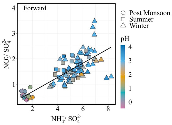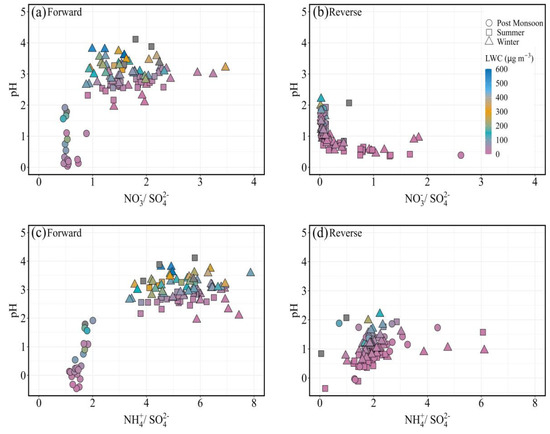 The NO3−/SO42− and NH4+/SO42− molar ratios were calculated to assess the response of pH to the molar concentrations of NO3−, SO42−, and NH4+. Figure 5 displays the variation of FPM pH (estimated in both modes) for the PM2.5 samples as a function of the NO3−/SO42− and NH4+/SO42− ratio. The NO3−/SO42− ratio showed an increasing a negative trend with the aerosol pH in forward mode (Figure 5a). However, a negative trend is observed for aerosol pH in the reverse run (Figure 5b). As the NO3−/SO42− molar ratio increases and particles become gradually concentrated in NH4NO3, the pH of the aerosol increases [66]. The positive feedback between particle NO3− production and aerosol pH could be one of the reasons for such an increase [47]. Because of its strong hygroscopicity, nitrate also increases FPM water content (evident in Figure 5a,b), which lowers H+ concentrations in the aqueous phase and increases aerosol pH. The greater the pH of the aerosol, the more enrichment of NO3− will occur [66]. These results show that nitrate formation via gas-to-particle conversion involving ammonia and nitric acid increases aerosol pH as the ratio of nitrate to sulfate increases. In contrast, as ammonia emissions are reduced, there will be a drop in aerosol pH associated with an increase in nitrate relative abundance [66]. A similar increase in the NO3−/SO42− ratio has been reported from various parts of the world, including the United States and Canada [67,68,69]. As a result of this, PM2.5 is increasingly becoming acidic, with a lower pH for the HSO4−/SO42− system than the HNO3/NO3− system [70].