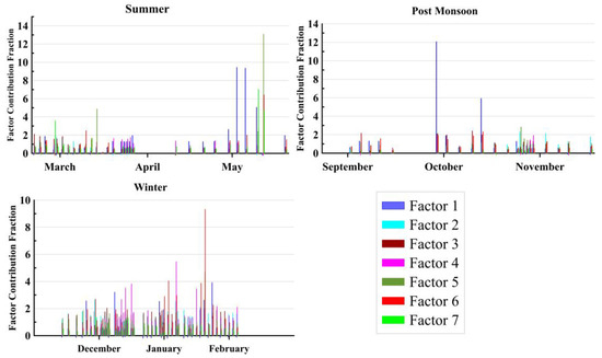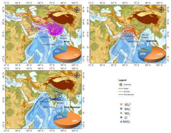 Figure 9 shows daily as well as seasonal variation of contribution by each factor, respectively. On average, the contribution of the SO42− factor was highest (51.6%) to the total WSIC, followed by the NVC source (18.5%), Cl− (10.4%), NH4+ (10.6%), NO3− (9.2%). In winter, the absolute contribution (µg m−3) was higher from each source factor than in the summer and post-monsoon periods. The percentage contributions (%) of the three seasons showed different patterns and were mainly dominated by SO42− among all the SIA. It is worth noticing that the concentration of SO42− was found to contribute the highest to PM2.5 during the winter season than in the other two seasons. This is possibly due to long-range transport from the Indo-Gangetic Plains (IGP), which is also supported by the air mass back-trajectory analysis (AMBT) shown in Figure 10. It is evident from the AMBT analyses that the marine air parcel is dominant during the summer season (Figure 10). Moreover, SO42− is high during summer, which can be attributed to the oxidation of Dimethyl sulfide (DMS) in the marine region, primarily from marine plankton, as well as via anthropogenic sources. On the basis of these findings, concentration-AMBT maps were created to identify sources that contribute to PMF components. The AMBTs during summer and post-monsoon seasons were mostly derived from the desert region, which are potential sources of mineral dust. High sulfate content during post-monsoon months associated with low pH and vice-versa during summer and winter months indicate a potential role of sources in impacting the pH and LWC of the aerosols.