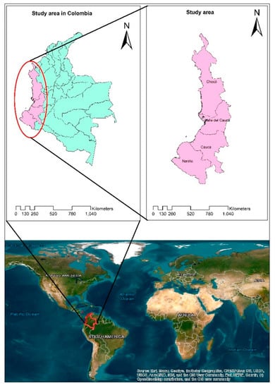 The Pacific region of western Colombia (0.4° N–8° N, 75.9° W–78.9° W: Figure 1), encompasses a total area of 130,000 km2 and has a population of eight million. The region is subdivided into the departments of Choco (5° 42′ N and 76° 40′ W), Valle del Cauca (3°25′ N and 76°31′ W), Cauca (2°27′ N and 76°37′ W), and Nariño (1°10′ N and 77°16′ W). The Colombian massif rises from sea level to 4748 m in the Central Cordillera; this and the Western Cordillera form the two mountain ranges that make up the region. The Colombian massif stores 70% of Colombia’s water supply [].