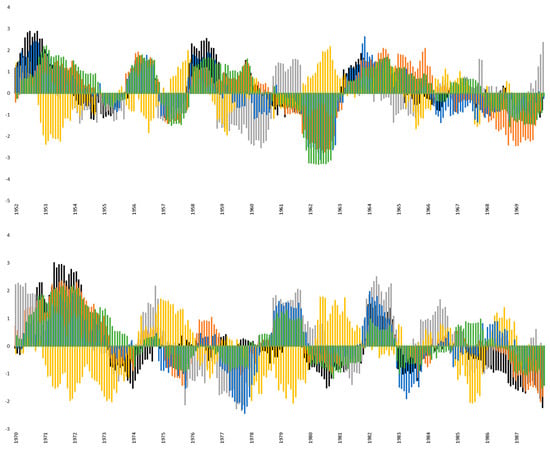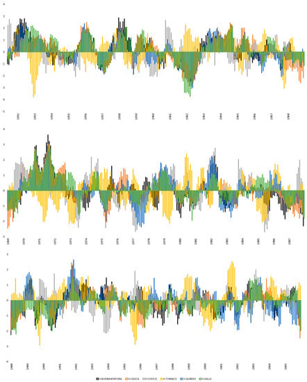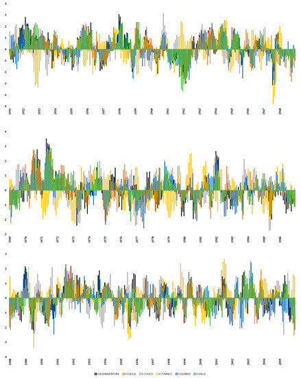 We calculated SPI 12 values for a total of 649 months in the 1951–2005 period (Figure 4). Extreme Dryness had the highest incidence of 3.7% in Cauca and the lowest incidence of 1.2% in Buenaventura. However, extreme wetness had a higher incidence of 5.4% in Buenaventura and the lowest incidence in Tumaco (0.5%). The incidence of Severe Dry events was 5.6% and 1.7% in Tumaco and Quibdo, respectively. The incidence of Very Wet conditions was 7.2% in Quibdo and 2.3% in Buenaventura. Moderate Dryness and Wetness were observed in Tumaco (10.8% and 13.3%, respectively). SPI 12 revealed Extreme Dry events for eight years and Extreme Wet events for nine years. The longest regular Extremely Dry years were 1962, 1968–1969, and 1977, whereas the longest Wet years were 1951, 1957–1958, 1971, and 1982.