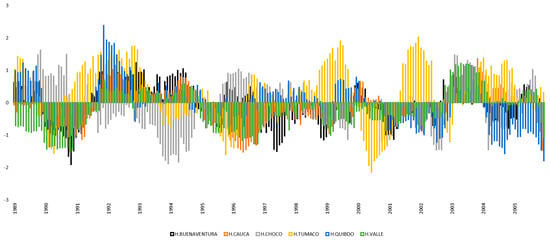 Six−month standardized precipitation index in Colombia’s Pacific region, 1951–2005.