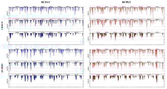 In SPI 6 projection for 2022–2040, the regional average incidence of Extremely Wet events Under RCP 4.5 was 1.6% (from 0.4% in Cauca to 1.7% in Quibdo and Valle). Under RCP 4.5, Very Wet events had a regional average incidence of 6.3% (Tumaco: 7%; Choco, Buenaventura, and Valle: 6.6%). Under RCP 8.5, such events had a regional average incidence of 5.6%. Under the latter scenario, the incidence of such events in Tumaco and Valle was 3% lower than that under the RCP 4.5 scenario. In the other four locations, however, the incidence of Very Wet events followed the same trend as that under RCP 4.5. In 2041–2070, Extreme Wetness registered a regional average incidence of 2% under RCP 4.5 and 1.3% under RCP 8.5. In Buenaventura, the incidence of such events decreased from 3.6% under RCP 4.5 to 0.3% under RCP 8.5. Very Wet events showed a regional average incidence of 3.3% under RCP 4.5 and 3.5% under RCP 8.5. Under the latter scenario, the occurrence of such events in Quibdo increased to 4.1% (from 1.9% under RCP 4.5). In the 2071–2100 period, under RCP 4.5, Extremely Wet events had an incidence of 6.1% in Choco, 3.3% in Quibdo, 1.4% in Valle, 0.8% in Buenaventura, and 0.6% in Cauca and Tumaco. In comparison with RCP 4.5, under RCP 8.5, these values increased by 3% in Valle and 2% in Buenaventura and decreased by 2% in Choco. Very Wet events had a regional average incidence of 4% under RCP 4.5 and 4.6% under RCP 8.5.
