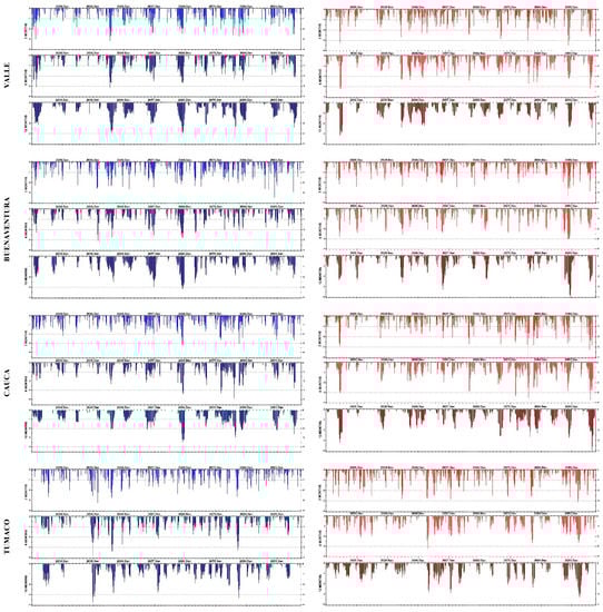 The local climate ranges from extremely humid (an annual rainfall of 3000–7000 mm) in the lowlands to pluvial (an annual rainfall of more than 7000 mm) in the heart of the region. The region around the Atrato River (Choco) has one of the highest rainfall values in the world, reaching 10,000 mm/yr. This contrasts with the south of the Pacific region (the departments of Cauca and Nariño) where the Andes Cordillera determines different climatic conditions. Humid plains with rainfall of 2001–3000 mm/yr occur on the slopes of the Western Cordillera. Where the landscape is more mountainous and Andean in character, rainfall is up to 2000 mm/yr and the climate is drier []. In summary, the overall climate of the country is dominated by summer and winter. December, January, and February can experience intense drought, while May, June, and July are more humid []; these time intervals are important for SPI calculations.