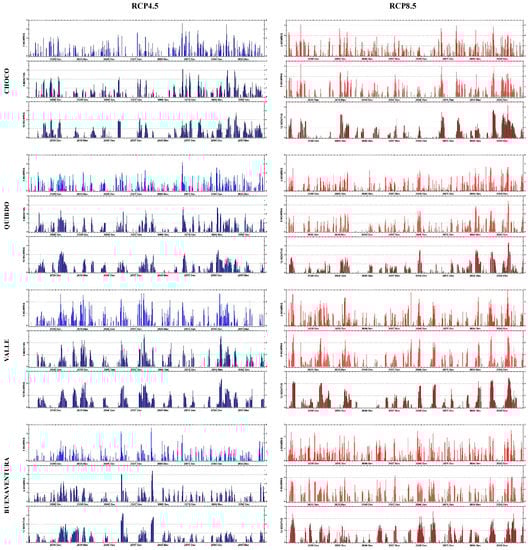 According to SPI 12 projections for 2022–2040, under RCP 4.5, Extremely Wet events had an incidence of 5.7% in Quibdo, 3, 2, and 1.3% in Tumaco, Choco, and Valle, respectively, 0.9% in Buenaventura, and no occurrence in Cauca. Under RCP 8.5, however, the incidence of such events fell to 6% in Valle and zero at Quibdo but rose to 4.4% in Cauca (Figure 6). Under RCP 4.5, Very Wet events registered a regional average incidence of 5.8% (from 9.6% in Buenaventura to 1.7% in Cauca). Under RCP 8.5, the incidence of such events decreased by 4.4% in Buenaventura. In 2041–2070, under RCP 4.5, Extremely Wet events were recorded at an incidence of 6% in Buenaventura, 2.2% in Tumaco, 1.4% in Cauca, 0.6% in Choco and Quibdo, and 0.3% in Valle. Under RCP 8.5, the incidence of such events decreased by 5% in Buenaventura and remained unchanged at all the other sites. The regional average incidence of Very Wet events was 3.5% under RCP 4.5 and 2% under RCP 8.5. At Choco, the incidence of such events decreased from 4.7% under RCP 4.5 to 0.6% under RCP 8.5. In 2071–2100, under RCP 4.5, Extremely Wet events registered an incidence of 5% in Choco, 3.3% in Quibdo, 1.9 and 1.4% in Valle and Tumaco, respectively, and there was no occurrence in Cauca and Buenaventura. Under RCP 8.5, the incidence of such events increased by 5% and 4% in Quibdo and Valle, respectively, and remained unchanged in all the other areas. Under RCP 4.5, Very Wet events had an incidence of 8.9% in Choco, 6.7% in Tumaco, 6.1% in Quibdo, 2.7 and 2.5% in Valle and Cauca, respectively, and 0.3% in Buenaventura. Under RCP 8.5 forcing, the incidence of such events increased by 7 and 5% in Buenaventura and Valle, respectively, and decreased by 3% in Quibdo.