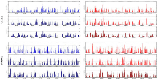 Using the historical dataset, we calculated SPI 3 values in Colombia’s Pacific region for 658 consecutive months from 1951 to 2005 (Figure 2). The probability of an extreme event ranged from 1.5 to 3.2%, depending on whether the event was Extremely Dry or Extremely Wet. During 1951–2005, the occurrence of Extremely Dry events was reduced by 3.2% in Tumaco, with the highest ratio among the six study areas, followed by Extremely Wet events in Buenaventura and Valle. Near-normal precipitation had the highest incidence (around 70%) across the Pacific Region. Moderate Dryness had an incidence of 10 and 11% in Cauca and Valle, respectively, while Severe and Extreme Dryness accounted for an average of 9% each. Choco and Buenaventura had the highest and lowest incidence of Wetness (9.9%) and (7.3%).