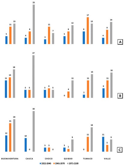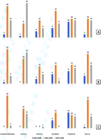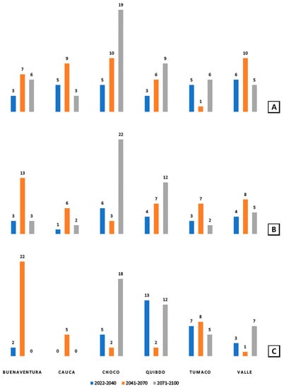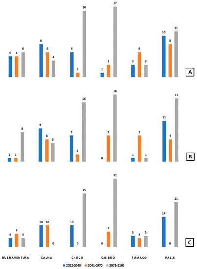 Number of Extremely Dry events in Colombia’s Pacific region under the RCP 8.5 scenario (2022–2100). (A) SPI 3; (B) SPI 6; and (C) SPI 12.