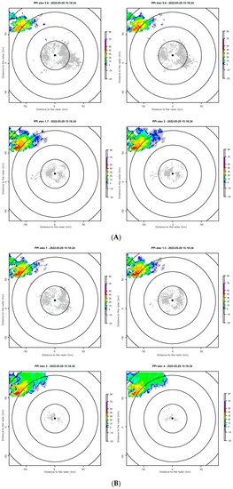 Figure 6. (A) Elevations of the PPI fields (0.6, 0.8, 1.7, and 2°) of the same case as Figure 4 (PDA radar, 29 May 2022). (B) As in Figure 6A for the 1, 1.3, 3, and 4° PPI elevations (PDA radar, 29 May 2022). (C) As in Figure 6A, but for the CDV radar (29 July 2022). The TBSS signature is marked with a purple triangle (in 1.7 and 2° PPI elevations). (D) As in Figure 6B, but for the CDV radar (29 July 2022). The TBSS signature is marked with a purple triangle (in 3° PPI elevation).