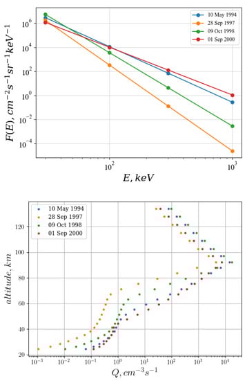 The ionization rate for the period under study was calculated considering the spectra presented in Figure 1. The calculation of the atmospheric ionization rate Q (number of ion pairs/gram/second) at a certain height (h), for all energies of electrons precipitating into the atmosphere, takes into account F(E)—the electron flow with kinetic energy (E) at the upper boundary of the atmosphere and the response functions of the atmosphere Y(E,h) on the precipitation of a monoenergetic single electron flux [19,20,21].