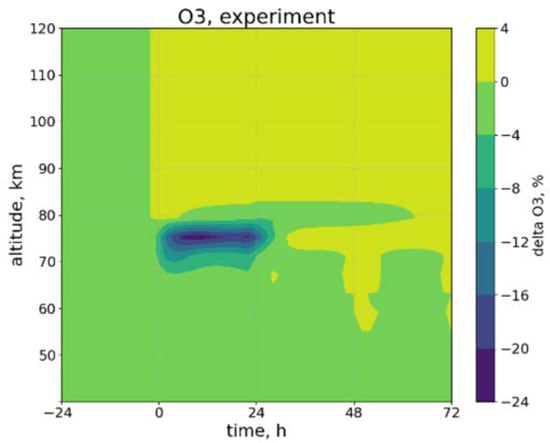 Figure 2 demonstrates that the main ozone depletion, up to 24% compared to the quiet period, occurs at an altitude of 75 km. In addition, it can be seen that after ozone recovery (after ~30 h), a certain cyclic process occurs, which is associated with diurnal variations in the ozone content in the atmosphere (at these altitudes, ozone accumulates at night, and is destroyed during the day). Ozone decreases at altitudes below about 80 km, which is caused by losses due to enhanced HOx catalytic cycles [2,24]. These cycles require atomic oxygen to be excited; atomic oxygen below 80 km is only abundant during daytime when it is produced in the photodissociation of O2. The above graph allows us to select for further study the level of 75 km, where the most significant decrease in ozone occurs.