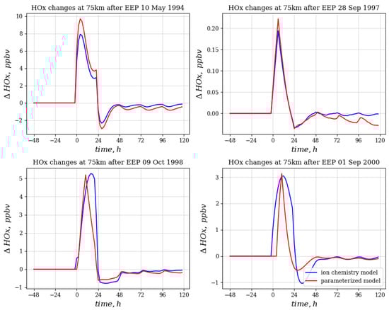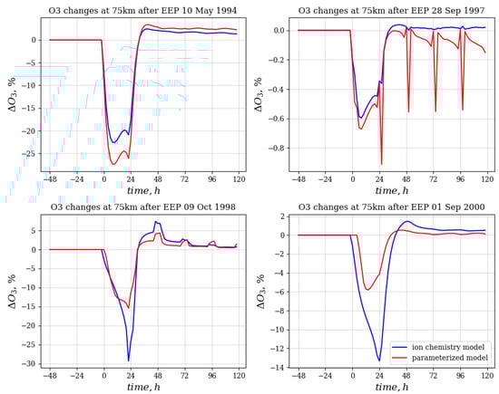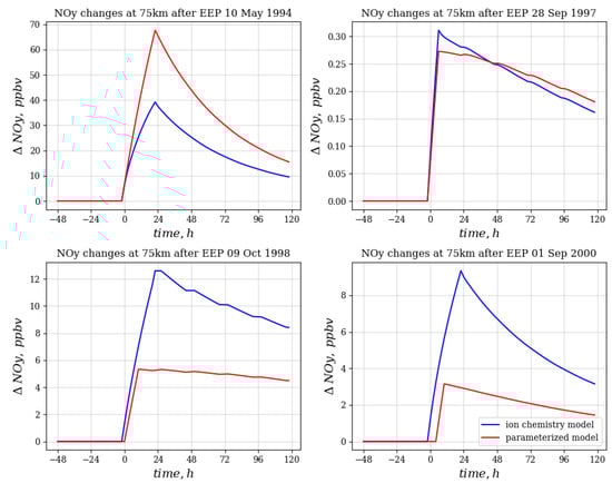 The dependence of the degree of ozone depletion on the approach used to account for ionic chemistry is quite complex. In the case of a strong event, both approaches give approximately the same effect, which is explained by the dominant effect of hydrogen oxides on ozone. For moderate events, the ion chemistry variant gives a much stronger ozone drop. This can be explained either by the additional influence of nitrogen oxides or by the activation of chlorine oxides, which manifests itself for some time after the event only with a moderate increase in the NOy concentration. It is important that the model working with the use of parametrization is not able to take into account the impact of this kind, therefore, in further studies, it is planned to use the model with ion chemistry. Additionally, diurnal variations of ozone content are seen. During events of 9 October 1998 and 28 September 1997, these variations are observed: a day after the EEP impact saw that the ozone amount accumulates by midnight and dissipates after noon because of the sunlight presence. It is harder to observe such effect for the remaining two events because of longer daytime duration in May and beginning of September. In addition, we do observe the results of the enhanced catalytic HOx cycle [24,35]: there is an increase-decrease-increase pattern of ozone depletion, which is observed on the 10 May 1994 EEP event clearly.