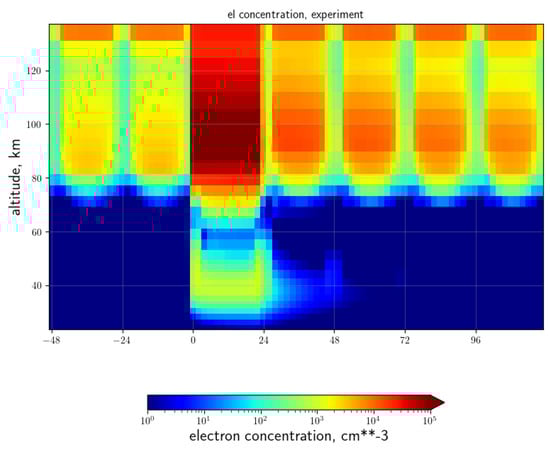 Figure 6 shows an example of the electron density induced by EEP and estimated by the model with interactive ion chemistry, taking into account information about EEP flux and spectra from balloon observations. Here, we observe that the electron concentration during geomagnetic disturbances reveals the D and E ionospheric layers. A strong increase in the electron concentration by two orders of magnitude at altitudes from about 30 to 120 km can be caused by EEP during geomagnetic disturbances with Kp = 4. Due to the efficient process of electron-ion recombination, after 24 h, the electron concentration returns to the normal form of the diurnal cycle after EEP forcing, which is clearly observed at altitudes above 80 km. At these altitudes, there is a change in the electron density: 103 electrons per cm3 before the EEP event, 105 electrons per cm3 during the EEP event. Then, there is a decrease in the increased concentration (reaches 104 electrons per cm3), which does not reach the concentration values before the event for 4 days. At altitudes below 80 km, a 24-h EEP effect is also defined. Although the increase in electron concentration is orders of magnitude greater than at upper altitudes, relaxation occurs much faster: the effect is noticeable only for 2 days.