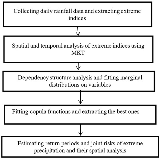 The spatial distribution of return period values and bivariate risks is displayed, using the Kriging interpolation method. A flowchart of the computational steps and practical steps is shown in Figure 2.
