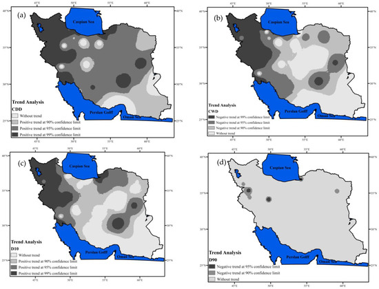 Figure 4b shows the CDD (consecutive dry days) trend. The trend of dry days increased in more than 92% of Iran. This increase was more intense in the west and the middle parts of Iran. The spatial distribution of D10 is represented in Figure 4c, which shows that this index was increasing in large areas, including the west, north, and east of Iran. The trend was more severe in the north and west, while D90 was decreasing for the entire country.