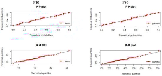 The results showed that, on the basis of the AIC criterion, the negative binomial type I, Poisson, Poisson inverse Gaussian, and Poisson distributions performed best in modeling CWD, CDD, D10, and D90, respectively, while the log-normal and gamma distributions better fitted the P10 and P90 indices. Figure 5 displays the quality of the fitted distributions for the P90 and P10 indices at the Bobolsar station based on graphical criteria.