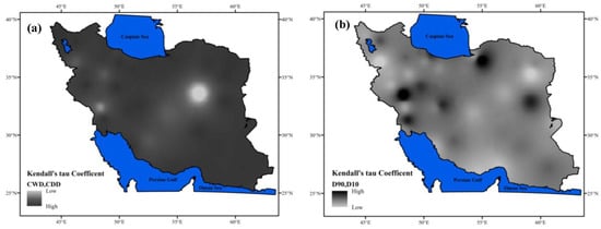 Alexander et al. [39] showed that the CDD was relatively decreasing at most stations in the continental part of the Earth during 1951–2003, which can be interpreted as similar to the prediction of the Intergovernmental Panel on Climate Change (IPCC). In most parts of Iran, the possibility of occurrence of CDD is increasing, which has been reported by Alijani et al. [40], Razie et al. [41], and Asgari et al. [42]. In this sense, Iran will be subjected to increasing risks of drought hazard.