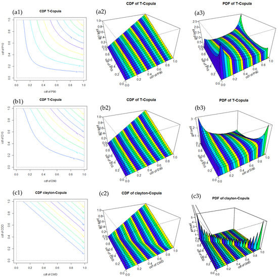 Goodness of fit graphs for fitted copulas for the studied variables at the Babolsar station (a1–a3): contour plot P10, P90; CDF and PDF; (b1–b3): contour plot D10, D90; CDF and PDF; (c1–c3): contour plot CDD, CWD; CDF and PDF.