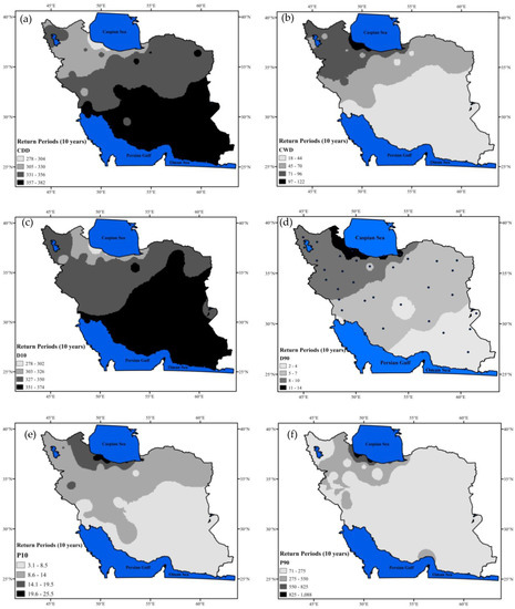 Spatial distribution of extreme precipitation indices for ten-year return periods across Iran: (a): CDD; (b): CWD; (c): D10; (d): D90; (e): P10; (f): P90.