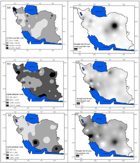 Risk analysis of extreme precipitation indices for ten-year return periods across Iran: (a): CDD; (b): CWD; (c): D10; (d):D90; (e): P10; (f): P90.