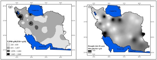 The spatial distribution of represented in Figure 10g indicates that there was a high possibility of a long drought duration with low rainfall occurrence. This figure also shows that the joint probability of P10 and D10 was high in the west and southwest regions, medium in the middle and east regions, and low in the southeast coastal region in Chabahar and some parts of Fars province. In this regard, Figure 10h represents a high risk in some parts of Kerman in the Lut desert (central basin) and some parts of Karkheh basin and its inlet in the western province of Iran.