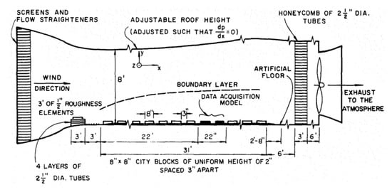 The wind tunnel experiment is based on the principle of motion similarity. By constructing a miniature model of the vehicle pollutant dispersion scene, the dispersion mechanism of vehicle pollutants can be analyzed according to the movement trajectory of the traceable gas under the action of the wind field. For example, Wedding et al. built a 400:1 dispersion model to simulate the dispersion process of vehicle pollutants in a real street environment, which was described by an aerodynamically rough turbulent boundary layer of neutral thermal stratification. The results showed that a single isolated building is prone to mixing pollutants downwind and forming a high concentration area on the leeward side of the building (see Figure 1 taken from [9]).