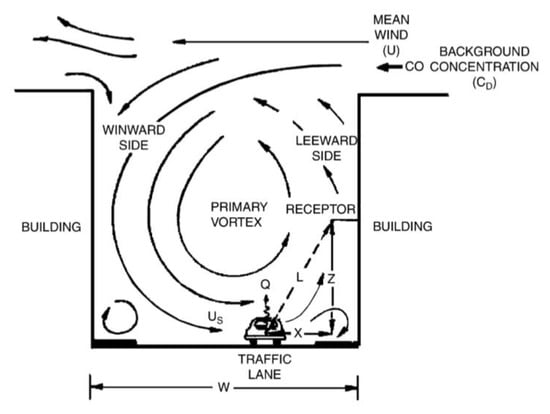 The STREET model was first developed by Johnson et al. in 1973, which considers the initial dispersion of pollutants from road traffic and the turbulent effect caused by the driving process of vehicles [27]. They estimated the pollutant concentration in two parts, the environmental background value of the urban environment and the concentration caused by the emission of pollutants from road vehicles. For the basic intraurban model, they treated road segments as line sources of emission pollutants, and the diffusion was calculated based on annular area segments that overlay the road segments of the traffic network. A simple box model was developed to formulate the contribution of CO concentration from each area segment to receptors individually. Moreover, the box model derives a street canyon sub-model to simulate the aerodynamic effects of structures on both sides of the street. The concentration of pollutants on the leeward side of the canyon is inversely proportional to the distance between the receptor and the line source, while the concentration on the windward side is only related to the vertical height of the receptor and the line source (see Figure 3 taken from [27]).