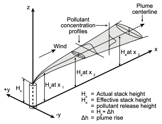The basic Gaussian model makes the following assumptions: (1) atmospheric stability and other meteorological parameters are uniform constants in the entire atmosphere and do not change with time, especially for the wind speed and direction; (2) turbulent flow is a random movement, so the time-averaged pollutant concentrations can be described by Gaussian or normal distribution in both horizontal and vertical directions (see Figure 4 taken from [37]); (3) the concentrations from a continuously emitting source are inversely proportional to the wind speed; (4) the plume will be reflected back into the atmosphere when it reaches the ground; (5) the plume only moves physically in the atmosphere without chemical and biological changes. Generally, because of turbulent reflections from the ground and the boundary atmosphere layer, the Gaussian distribution of the plume needs to be modified when the mixing height is low, and the plume’s width is determined by the parameter of σy and σz, i.e., the standard deviation of plume diffusion in the horizontal and vertical direction [38].