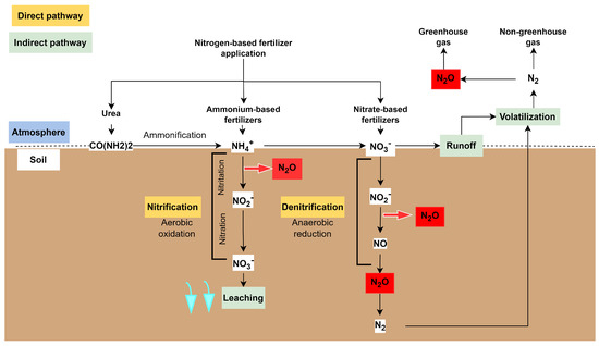 Soils naturally release due to the microbiological processes that are a part of the nitrogen cycle [29]. As shown in Figure 2, nitrogen-based fertilizers when applied to the soil, some of it is taken up by the plant, while the rest is converted by soil microorganisms or lost through volatilization/leaching. The greatest sources of indirect emissions come from agricultural leaching and runoff, which account for around 30% of the nitrogen lost from agricultural soils [28]. On the other hand, denitrification and nitrification through microorganisms involve the direct emissions pathway of . Under aerobic conditions, the conversion of to occurs under the name of nitrification, while the denitrification process takes place involving the conversion of to , with acting as an intermediate product [30].