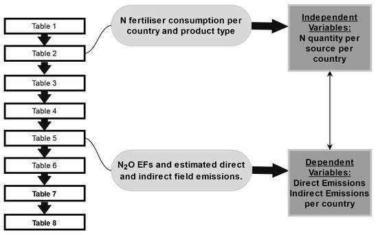 The data were derived from a recent study [12], where they estimated GHG emissions per capita terms for the year 2018, due to multiple synthetic N fertilizer parameters, namely, manufacture, transportation, and field use in agricultural systems. This field-level dataset available on soil emissions was estimated based on global direct emission factors (EFs). From the literature, EFs for indirect soil emissions and N fertilizer manufacturing and transportation were extracted. The original dataset is organized in a .xlsx format file, with eight tables. We extracted data from tables 2 and 5 as shown in Figure 3.