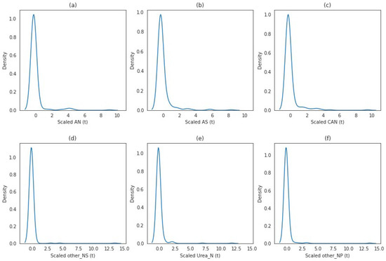 Figure 4. Density plots of selected nitrogen fertilizer consumption per tonne (t) per country: (a) density plot of ammonium nitrate (AN), (b) density plot of ammonium sulfate (AS), (c) density plot of calcium ammonium nitrate (CAN), (d) density plot of other NS, (e) density plot of urea, (f) density plot of other NP.