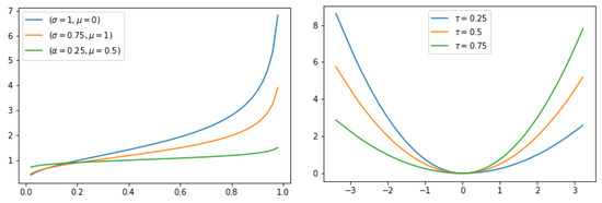 is the asymmetric least square (ALS) loss function that assigns weights and to positive and negative deviations, respectively. Figure 5 provides example curves of and expectile values with respect to different expectile levels , respectively.
