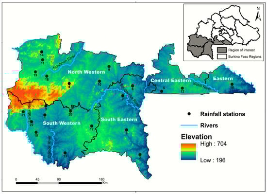 Topography, main rivers, and rainfall stations of the study area are located in the southern part of Burkina Faso. Eastern, central eastern, northwestern, southeastern and southwestern are administrative areas of Burkina Faso corresponding to Nahouri, Sissili, Haut-Bassins, Sud-Ouest, and Cascades.