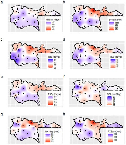 Distribution rainfall indices given as the climatological average of R1day (a), PRCPTOT (b), R10 (c), R20 (d), R95p (e), SDII (f), RX1day (g), and RX5day (h) distributed over the study area. Circles denote climate stations. The blue (respectively red color) represents the areas with the index value higher (respectively lower) than the climatological average of the study area and the white color corresponds to the value close to the climatological average of rainfall indices. Maps are obtained by interpolating station values using the IDW method.