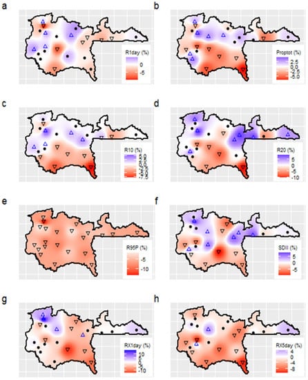 Trends in rainfall indices given as change per decade in % for R1day (a), PRCPTOT (b), R10 (c), R20 (d), R95p (e), SDII (f), RX1day (g), and RX5days (h). Upward/downward triangles denote stations with statistically significant upward/downward trends at the 5% significance level. Circles show stations with non-significant changes. Maps are obtained by interpolating station values using the IDW method.