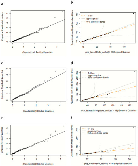 where and are the maximized log-likelihood functions of the nonstationary model M and the stationary model M0, respectively. The deviance statistic D follows a Chi-square distribution of υ degree of freedom, where υ is the difference in the number of the parameters of M and M0 [34]. The model M0 is nested within M with the parameters of M0 being a subset of the parameters of M. In this case, if the p-value of the deviance statistic D is lower than 5%, then the hypothesis that the stationary model M0 is preferred over the nonstationary model M is rejected. In that case, the nonstationary Poisson-GP model with parameters depending on Atlantic SST better fits the extreme rainfall than the stationary model with constant parameters. Once the choice between the stationary and nonstationary model was conducted based on the deviance test, it is necessary to check whether the adopted model fits the data well. To assess model validity, quantile plots and probability plots are commonly used graphical methods to perform model diagnosis in the univariate framework of extreme value analysis [34]. Considering ≤ as an ordered sample of the independent observations used to estimate the selected model, then a probability plot consists of the points