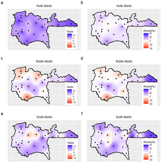 Slope values of the linear relations between SST and extreme rainfall. Left column: Slope values () for the frequency of extreme rainfall. A value of n means an n-fold increase in the frequency of extreme precipitation per °C increase in SST. Right column: Slope values (, , and ) for the intensity of extreme rainfall. A value of n means an n% increase in the intensity of extreme precipitation per °C increase in SST. Rows represent the different covariates, i.e., SST of North Atlantic (upper), SST of Middle Atlantic (middle), and SST of South Atlantic (lower). The impact of Atlantic SST on extreme rainfall is estimated at the station level and interpolated spatially using the IDW method. The circles are rainfall stations. Figures (a,c,e) express the influence of upper, middle, and lower Atlantic SSTs, respectively, on the frequency of extreme rainfall. Figures (b,d,f) represent the influence of upper, middle, and lower Atlantic SSTs, respectively, on the intensity of extreme rainfall.