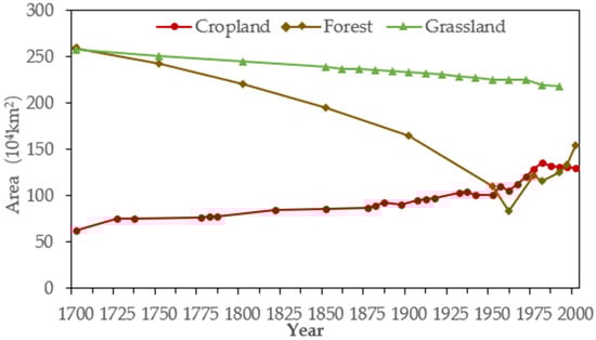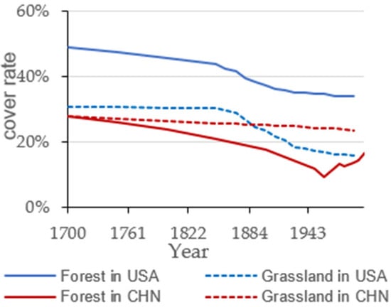 The main manifestations of the past 300 years of human land use are changes in the land cover area of various types of land. Land cover types such as cultivated land, forest land, and grassland are dominant, although construction land, industrial and mining land, etc., are disturbed by humans. However, the total area of these land types is relatively small. In this study, we investigated land cover change data on cultivated land, forest land, and grassland in China and the United States for a period of nearly 300 years. The data mainly come from the research results of relevant scholars and “Global Historical Environment Data (HYDE3.2)” and “Global Land Use Data Set (SAGE2010)” [,].