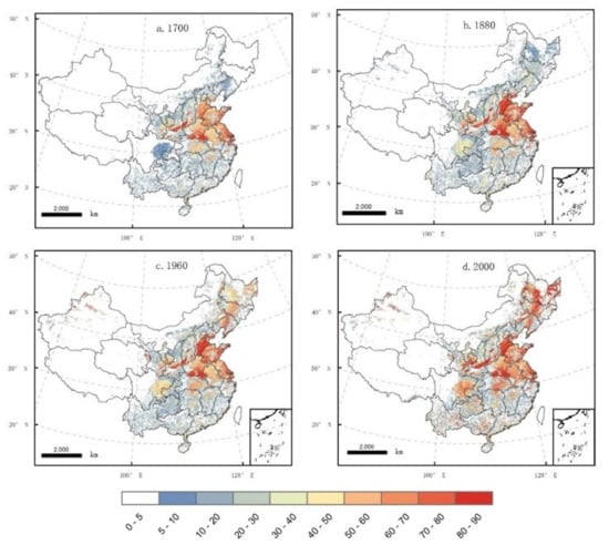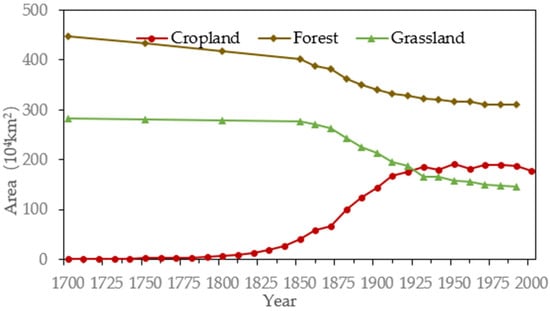 As shown in Table 1, the land cover change in China has undergone a long and slow period of transition. In the middle and late 20th century, land use gradually accelerated, and cultivated and forest land fluctuated significantly. China’s cultivated land area grew slowly in period of 1700–1880; the forest land and grassland area decreased gradually in the same period, but the forest land decreased faster than the grassland, with a forest land area growth rate of −0.23%. In the period of 1880–1960, the cultivated land area continued to grow gradually; in the same period, the grassland area decreased gradually, and the size of forest land fell rapidly, with a growth rate of forest land area of −1.08%. The reduction in the area of forest land is mainly due to the expansion of newly developed mountain areas. From 1960 to 2000, the cultivated land area in China fluctuated. The area of forest land also fluctuated, and the grassland area decreased rapidly.