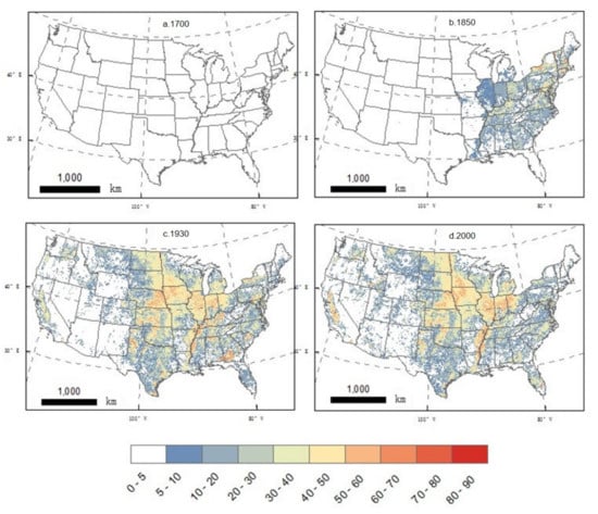 As shown in Figure 2 and Figure 3, the cultivated land area of China and the United States has generally increased in the past 300 years, but the latter has changed more markedly. As a long-standing agricultural country, China’s traditional agrarian area was deeply reclaimed 300 years ago. In 1700, the size of cultivated land in China reached nearly 62 × 104 km2 compared 107 × 104 km2 in 2000, an increase of 0.72 times. In contrast, for the United States, the cultivated land area was only 0.63 × 104 km2 in 1700, whereas in 2000, it was 178 × 104 km2, which is an increase of 282 times. It is noteworthy that the United States has covered the entire history of its development over the past 300 years because of its short history. Before 1700, there was only a tiny amount of land use.