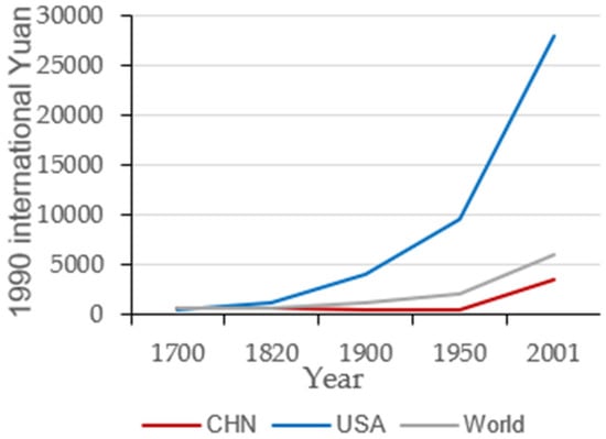 The populations of China and the United States have been increasing continuously over the past 300 years, which has driven land development. During the Qing Dynasty, China’s population increased continuously. Although the population was reduced as a result of war in the late Qing Dynasty, the population growth rate increased after the founding of the People’s Republic, from 170 million in the early Qing Dynasty to 1.3 billion at the end of the 20th century []. Because the United States is an immigrant country, the population base was small initially. However, there were many waves of immigration in the 19th century, and the population increased from 0.01 billion in 1700 to 280 million in 2000 []. China’s per capita arable land has decreased. Since the early days of the United States, with the expansion of territory and mechanization, the per capita arable land has increased. However, due to the increase in population, the per capita arable land has also gradually decreased.