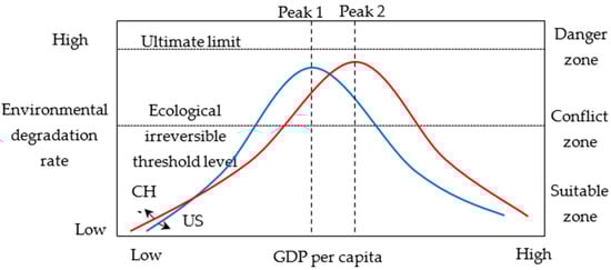 Combined with the above data analysis, the environmental Kuznets curve law shows a general trend of environmental degradation and economic development in China and the United States (Figure 8). The process of environmental change is differs between the two countries due to differences in social development. At first, China’s economic development level was high, and environmental degradation was more severe than that of the United States. However, in the later period, the US economy surpassed China, and the rate of environmental degradation increased. As their economies continue to develop, the United States and China will gradually reach the peak of the environmental degradation and progressively move towards an ecological balance driven by external factors. Still, the economy, policies, and population will affect the specific evolution process. Overall, the environmental degradation rates of both China and the United States have intensified with economic development over the past 300 years, eventually leading to ecological imbalances. However, with environmental problems, the improvement of production efficiency, and people’s demands for a better living environment, people began to protect nature. Many factors drove the environmental degradation rate to reach a peak, after which it gradually declined, and the environment returned to equilibrium. However, the relationship between man and land is delayed by land cover change. Many scholars have doubts about the environmental Kuznets curve. They believe that economic development only sometimes leads to environmental improvement. The notion that economic growth will automatically solve ecological problems is too optimistic and requires further investigation. To achieve coordinated development between people and the environment, countries at different action stages must formulate relevant policies to actively promote environmental protection.