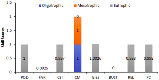 The categorical statistics and corresponding skill scores of FUI-based trophic state classification of Lake Tana (oligotrophic, mesotrophic, and eutrophic).