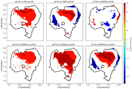 This lake-wide relationship between the two measures of trophic states is further investigated whether it exists between lake water FUI and TSM, TSI, turbidity, Chl_a, and CDOM at the pixel scale utilizing the Pearson correlation (Figure 4). Figure 4a shows that there is a statistically significant positive relationship between FUI and TSI over the central and northern parts of the lake. The correlation between TSI and FUI is statistically insignificant at the 95% significance level over nearly all shorelines of the lake, with exception of northern shorelines across 37.3 E. The correlation between FUI and TSM is positive over areas enclosed between 37.2 and 37.5 E northward of 11.9 N, where negative significant correlations are observed over the eastern shorelines and close to the western shorelines (Figure 4b). The negative correlation along the eastern shorelines includes the area covered by water hyacinths reported by previous studies [27,28,29,30,31]. A similar relationship between FUI and Chl_a (Figure 4f) was observed at the eastern shorelines. These parts of the lake are mostly mixed pixels of water and vegetation and probably the cause of negative correlations. Reflectance from the shallow surface at the shoreline could also alter the relationship between FUI and other OAC variables. As we have not applied any filter to remove either shallow parts of the lake or mixed pixels from the analysis, the FUI estimates near the shorelines may not be as robust as they are at the interior of the lake. In contrast, the relationships between the FUI and CDOM at the northern, western, and eastern-near shorelines of the lake are positive (Figure 4c). Again, it is likely the FUI estimates have suffered from the same sources errors as above. Our results also show that the correlation between FUI with both turbidity and FUBchl-a is strongly positive from the north down to the central part of the lake. Despite this, the relationship at the shoreline of the lake is statistically insignificant throughout the study period (Figure 4d,e). The strong correlation between FUI and turbidity covers broader parts of the lake revealing the direct relationship between the two. In view of the fact that the high performance of FUI is limited to only pure water pixels and deeper parts of the lake as revealed by the good agreement between FUI and turbidity, we restricted the further analysis to this portion of the lake.