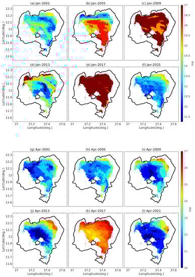 Interannual FUI variability over Lake Tana during winter month (January) and spring month (April) from 2001 to 2021.