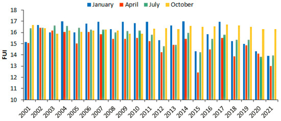 It is also important to investigate the interannual variability of FUI during a specific month to isolate interannual variability from seasonal variability. For example, during the winter month (January), the FUI time series shows that it increased from January 2001 (Figure 6a) to January 2005 (Figure 6b) and remained unchanged the following years (see 2009, 2013, and 2017 in Figure 6c–e) until it started diminishing in January 2021 (Figure 6f) reaching a value of 12 at the northern and central part of the lake. In the spring month (April), the FUI over the lake decreased except for spikes in 2017 (Figure 6g–l). The consistent decrease in FUI in both annual and spring FUI time series reveals that there are changes in the water quality drivers. Accordingly, further appraisal of the effect of changes in environmental drivers is necessary to understand the observed dynamics in the lake water quality during other seasons. The variability of FUI during the summer month of July showed a similar pattern of changes as in spring with a spike in 2017 and consistent improvement from year to year (Figure 6a–f). However, the changes in FUI during the autumn month of October do not show significant improvement except in 2021 over the northern and central part of the lake (Figure 6g–l). This pattern is somewhat similar to that of the winter month of January (Figure 6a–f). The lack of consistency between the seasons in terms of FUI variability might be linked to the difference in the scale of variability of meteorological and hydrological drivers during the different seasons. The lake-wide mean FUI during the peak months of summer, winter, spring, and autumn is in agreement with the observed FUI at the pixel level (Figure 6 and Figure 7) as noted from a consistent improvement in lake water quality from 2001 to 2021 for the months of April and July with a spike around 2017 and an insignificant trend during the months of January and October (Figure 8).