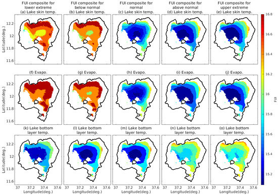 FUI composites over Lake Tana computed from FUI data belong to the periods of below normal, normal, above normal, lower extreme, and upper extreme values of skin temperature, lake bottom layer temperature, and evaporation.