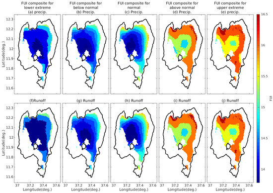 FUI composites over Lake Tana computed from FUI data belong to the periods of below normal, normal, above normal, lower extreme, upper extreme of precipitation, and surface runoff.